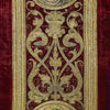 The slightly smaller one would have come from the front of a chasuble and the longer one from the back. They are worked in couched and brick stitch with gold and silver threads with coloured silks and applied to deep red velvet.